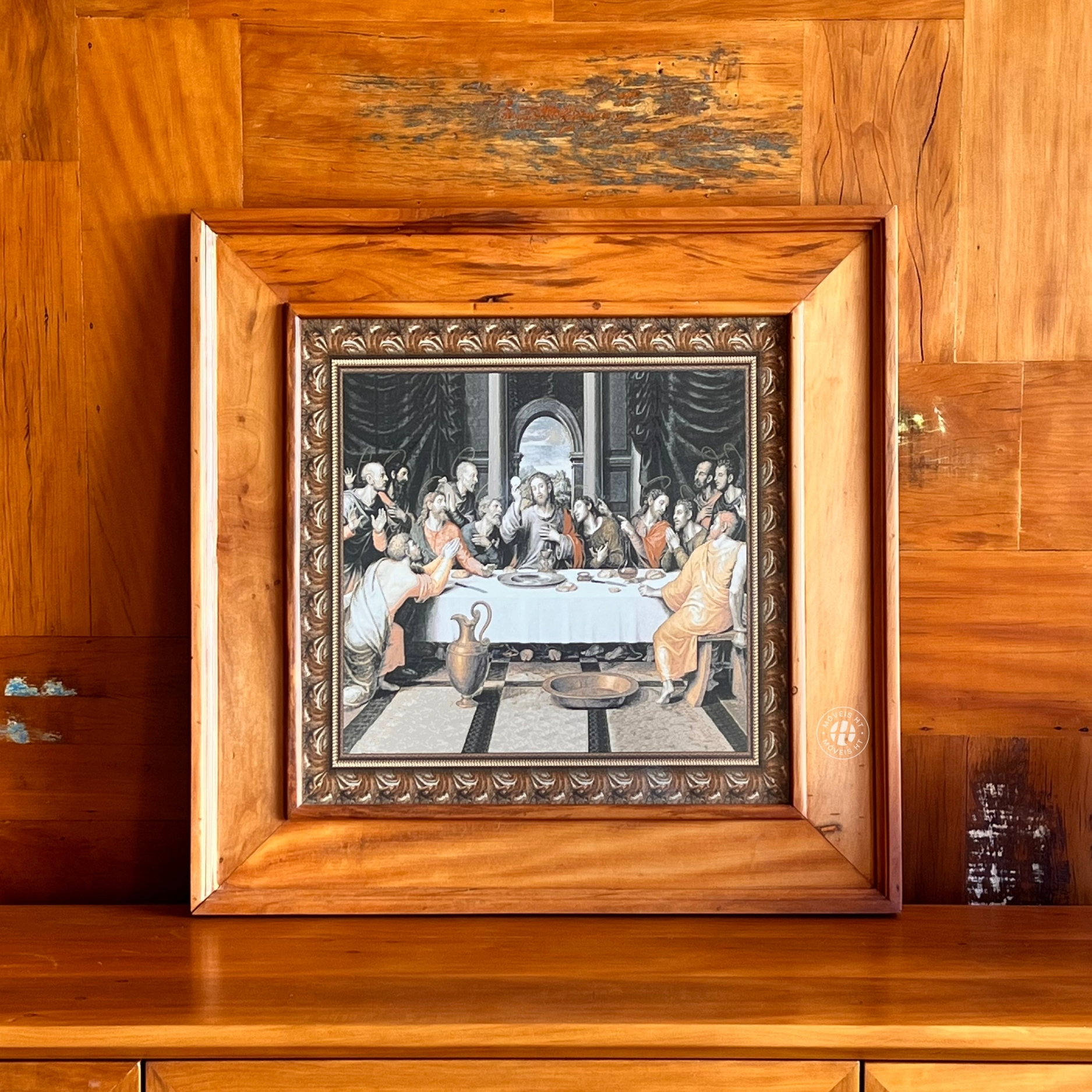 Moldura produzida em madeira de peroba rosa de demolição, material marcado por veios naturais que tornam cada peça única. No centro, uma placa em cerâmica que revela a imagem da Santa Ceia com delicadeza, equilíbrio e respeito à simbologia da cena.