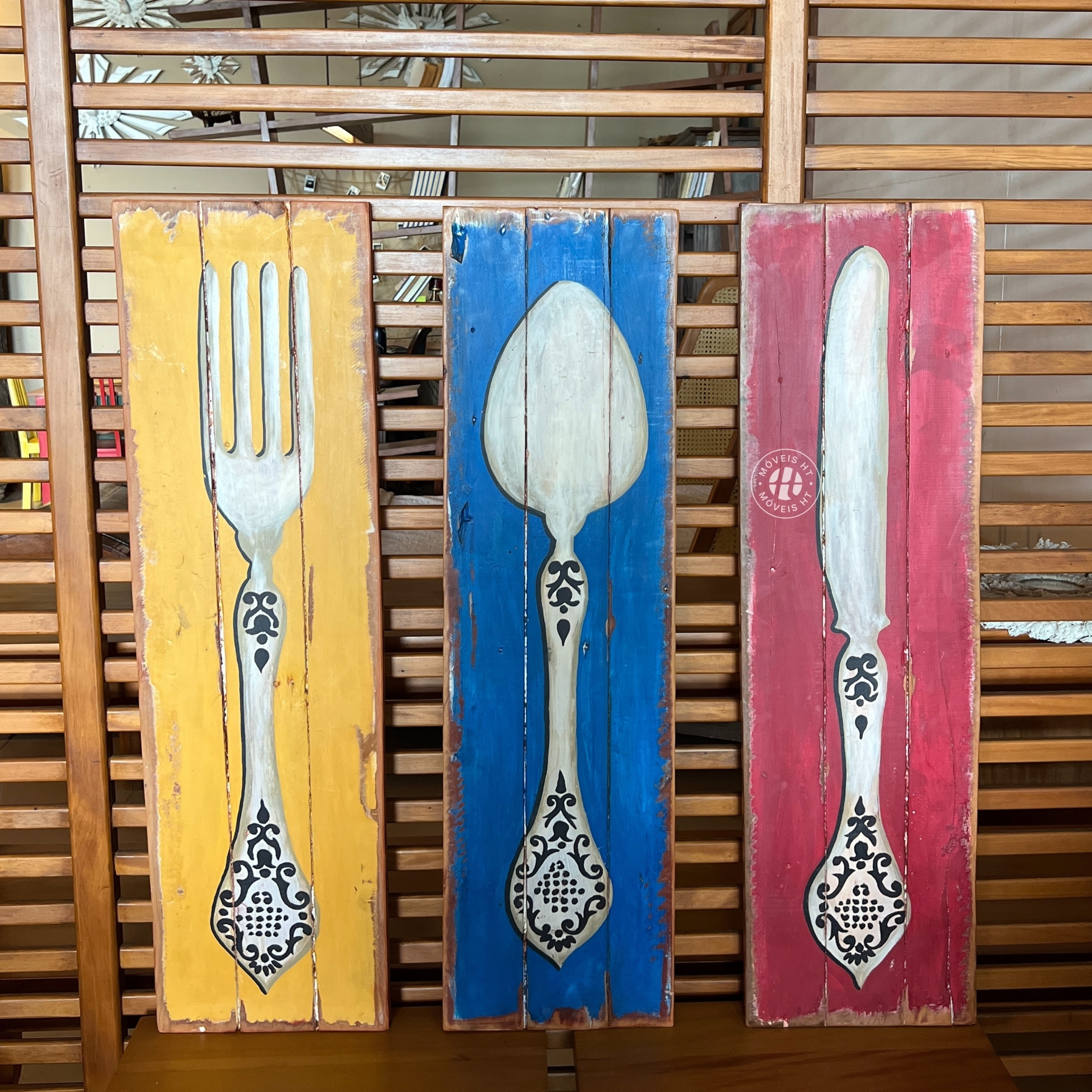 As cores vivas conversam entre si com harmonia, enquanto o estilo rústico valoriza a madeira e destaca, de forma única, os três talheres essenciais da cozinha: faca, garfo e colher, evocando o prazer de receber, compartilhar e celebrar momentos simples com beleza.